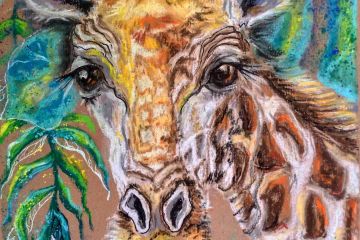 Работа выполнена на бумаге для пастели; материал: сухая пастель, ручка голевая; изображена голова жирафа.