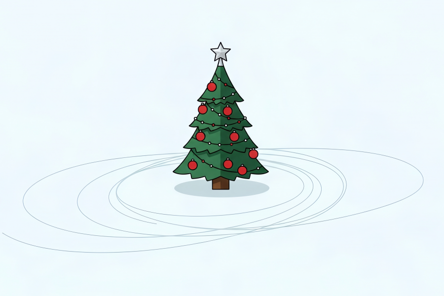 Минималистичная новогодняя векторная иллюстрация, созданная нейросетью: украшенная ёлка стоит посреди ледового катка, вокруг — следы от коньков. Лёгкая, праздничная и атмосферная графика для открыток, баннеров, анимаций и зимнего контента.