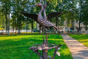 Железная скульптура двух аистов в парковой зоне деревни Рощино, Ленинградская область, Россия