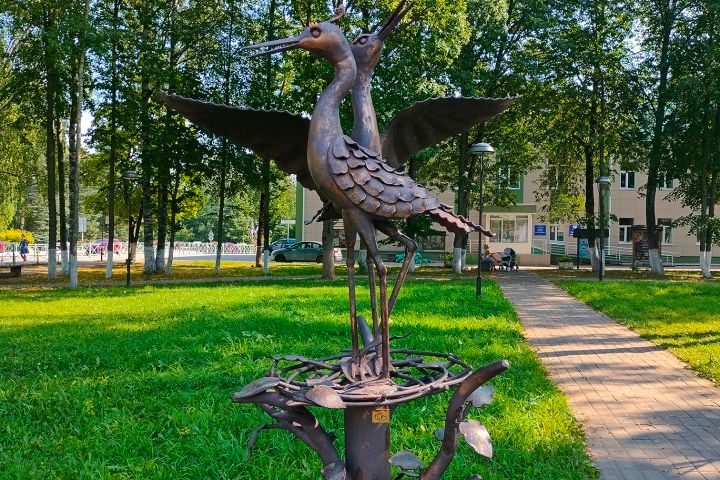 Железная скульптура из двух аистов в парке