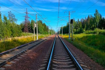 Железнодорожные пути с рельсами и шпалами ведут через лес за горизонт
