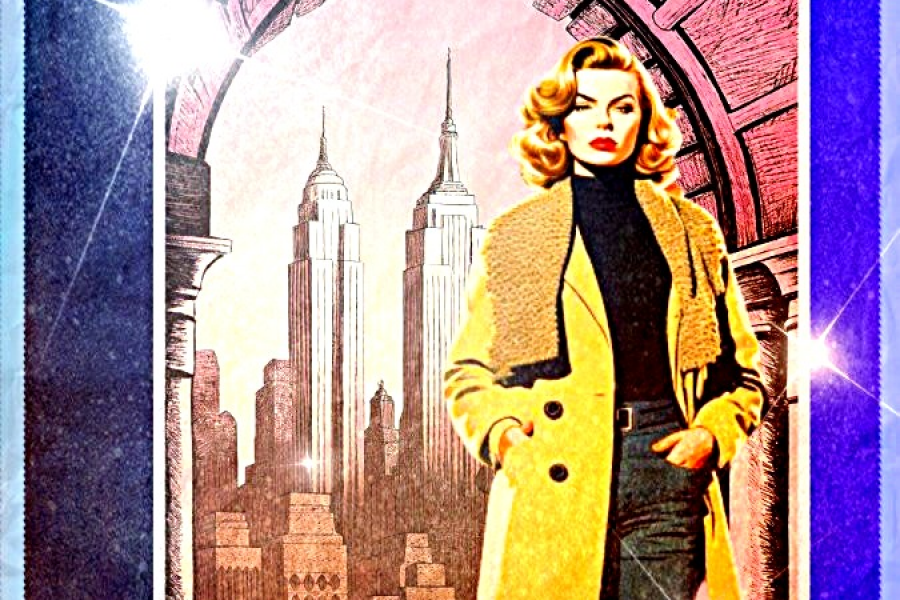 женщина в пальто на фоне небоскрёбов композиция прекрасно подойдёт для оформления кафе, кофеен и ресторанов (были использованы нейросети)
