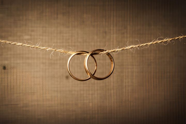 Два гладких золотых кольца подвешены на грубой бечёвке на фоне ткани тёплого оттенка. Изображение создано нейросетью. Минималистичная композиция с мягким светом создаёт ощущение уюта и естественности. Подходит для тем оформления, связанных с предметной съёмкой, украшениями и дизайном