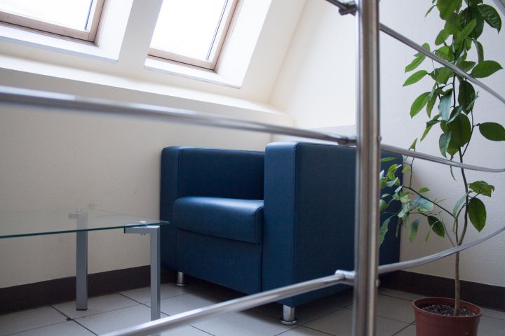 В зоне отдыха в офисном центре стоит синее кресло и стеклянный столик, рядом цветы.
