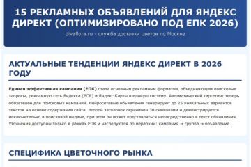 В комплекте: 15 готовых объявлений с двумя заголовками, текстами, уточнениями и быстрыми ссылками — всё по правилам Яндекс Директ 2026.