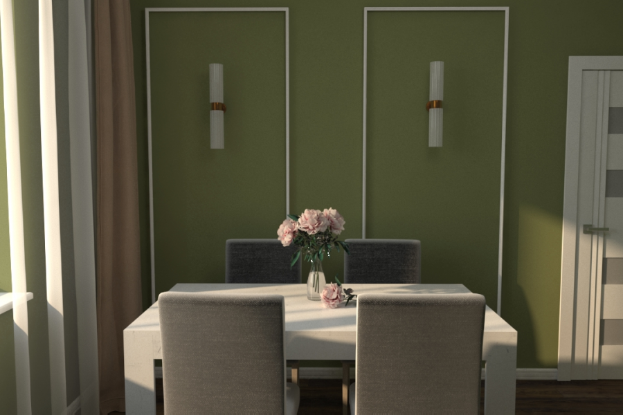 Интерьер строиться по предоставленным чертежам. Вся мебель и предметы интерьера (люстры, элементы лепнины, ковры, шторы и т.д.) выбираются из существующих сборников Исполнителя. Отделочные материалы интерьера и мебели выбираются из существующих баз Исполнителя, а при их отсутствии подбираются похожие. Количество ракурсов на одно помещение - не более 3-х.