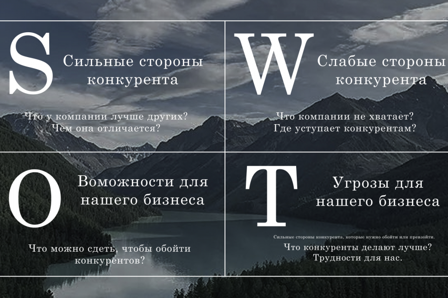 Анализ конкурентов о методу SWOT для вашего бизнеса в соц.сетях, с целью наиболее эффективного продвижения.