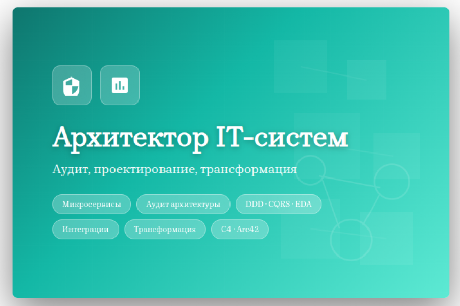 Специализации: Проектирование архитектуры (микросервисы, SOA, DDD, EDA, CQRS), аудит (узкие места, техдолг, риски), трансформация монолитов в микросервисы, интеграции (REST/gRPC, RabbitMQ, Kafka, API Gateway), документация (C4, Arc42, ADR).