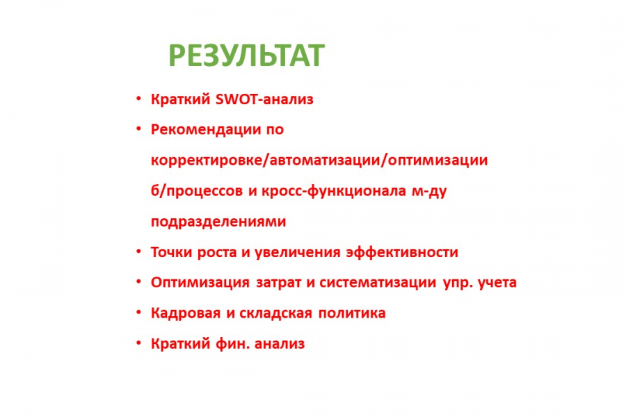 Результат: после 3х рабочих сессий Вы получаете дорожную карту в виде схемы с пошаговой инструкцией развития. Будут затронуты блоки производства, склада, продаж, закупок, кадровой и финансовой политики, реконструкция процессов, направленных на оптимизацию финансовых/трудоемких затрат и, как следствие, увеличение прибыли и сокращение рисков.