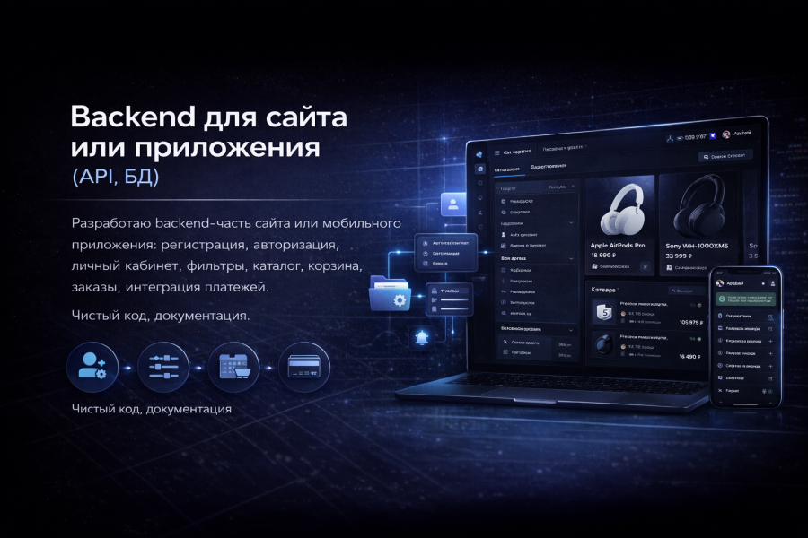 Разработаю backend-часть сайта или мобильного приложения: регистрация, авторизация, личный кабинет, фильтры, каталог, корзина, заказы, интеграция платежей. Чистый код, документация.