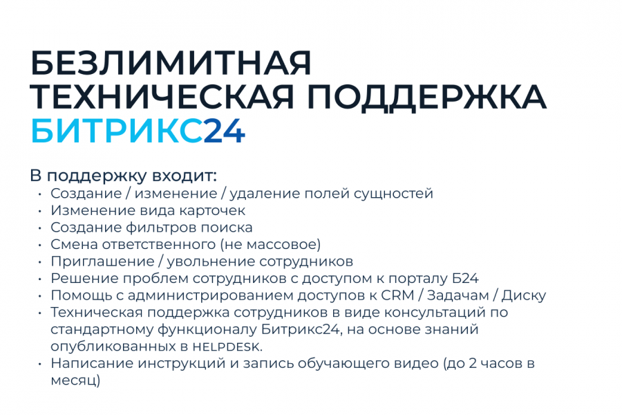 - Техническая поддержка сотрудников в виде консультаций по стандартному функционалу Битрикс24, на основе знаний опубликованных в hеlрdеsk.