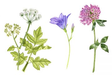 Ботанически точное изображение цветов, растений, фруктов на белом фоне для упаковки, дизайна, рекламы. Материал - акварель. Результат - обработанный (очищенный от фона) скан работы в форматах JPG (белый фон), PSD или PNG (прозрачный фон).
