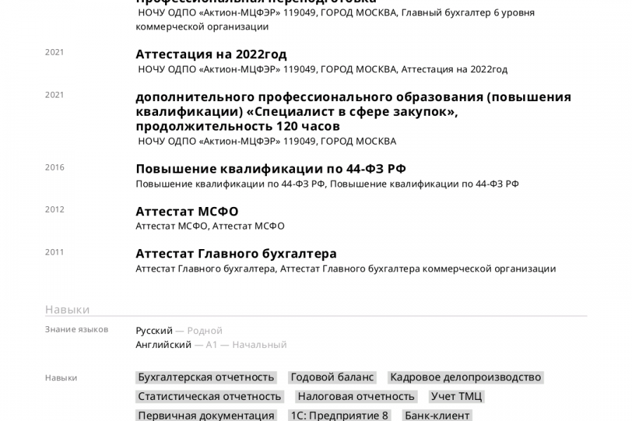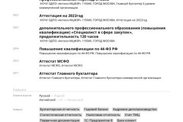 Высшее экономическое образование, большой опыт работы главным бухгалтером, знание всех участков учета, начисление зп, отчетность в ИФНС, СФР, РОССТАТ. Навыки работы в текстовых редакторах, excel, 1С 8.3, Контур, СБИС.