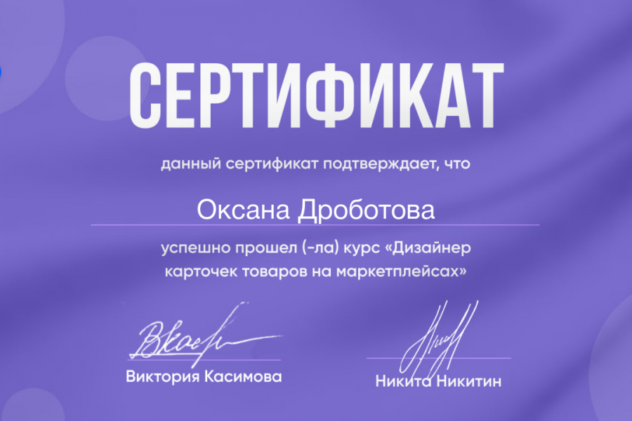 Меня зовут Дроботова Оксана Эдуардовна. Я Дизайнер карточек для МП.