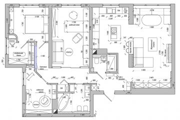 - рабочие чертежи (план монтажа/демонтажа стен, план расстановки розеток и выключателей, план освещения, план напольных покрытий и теплых полов, план потолков, развертки и отделка стен),