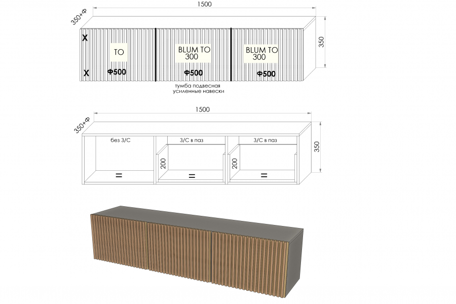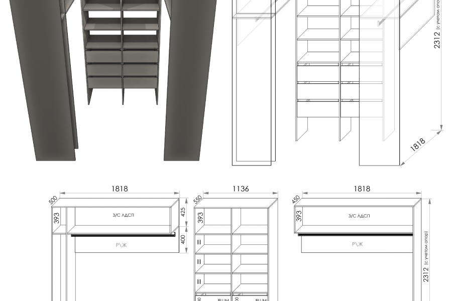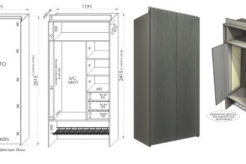 От 1500 руб. — тумбы, комоды, шкафы, шкафы-купе, гардеробные до 3 м погонных по стене (чертеж с размерами + простая визуализация в цвете).