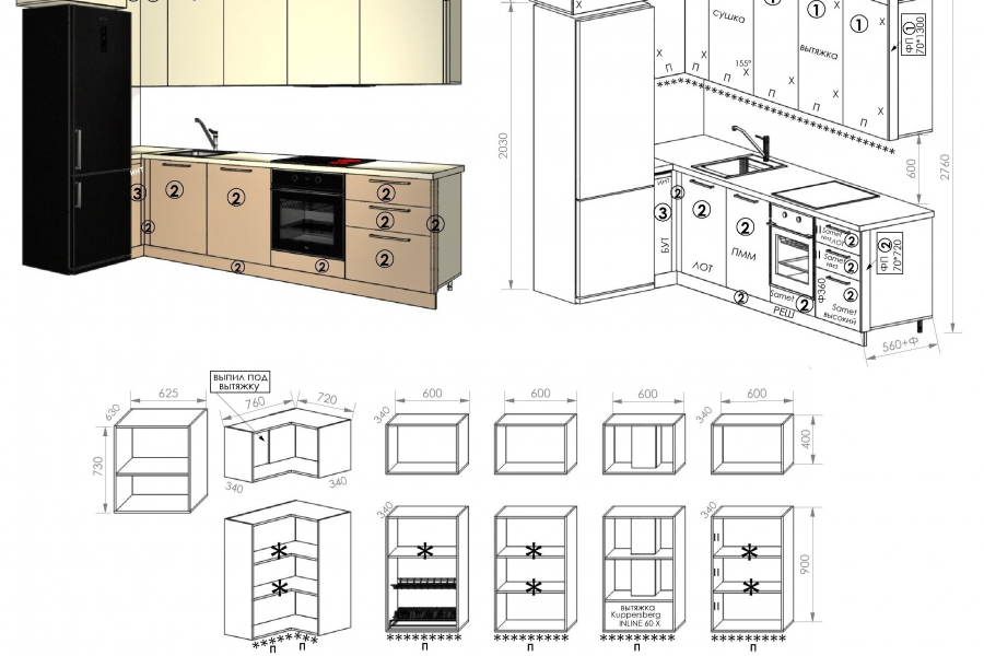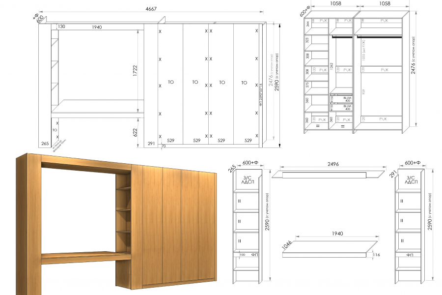 3000 — кухни, шкафы, шкафы-купе, гардеробные и т.д. (чертеж с размерами + простая визуализация в цвете).