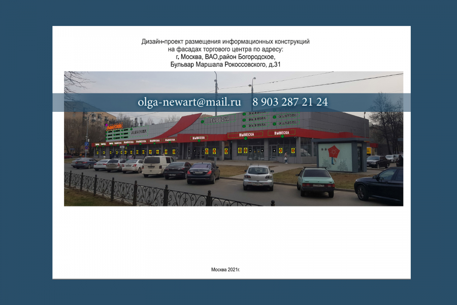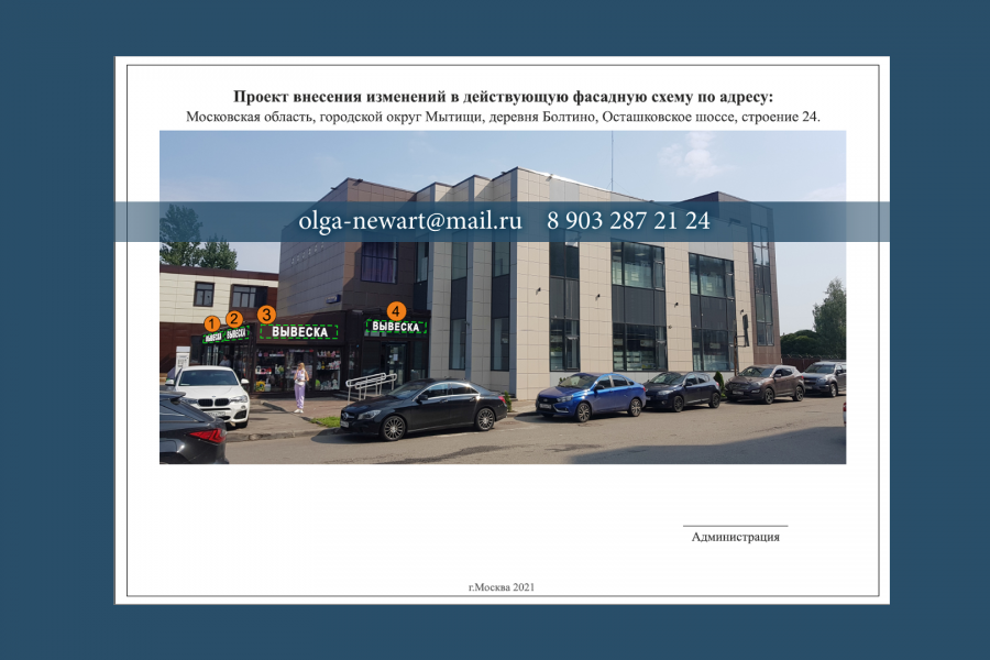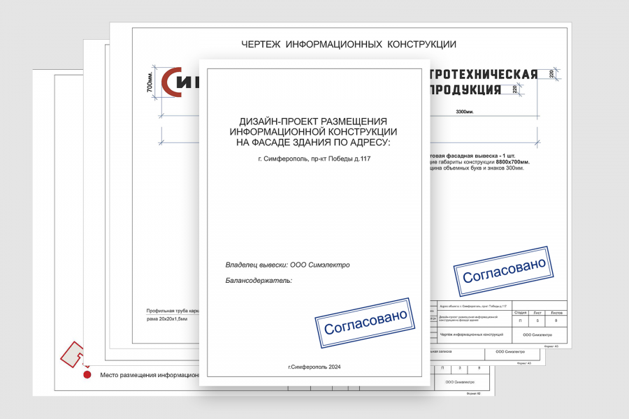 Дизайн проект вывески для согласования в администрации. Проект предусматривает текстовую и графическую часть, чертежи конструкции и техническое описание, габариты, характеристики, визуализация - фотопривязка вывески на фотографии.