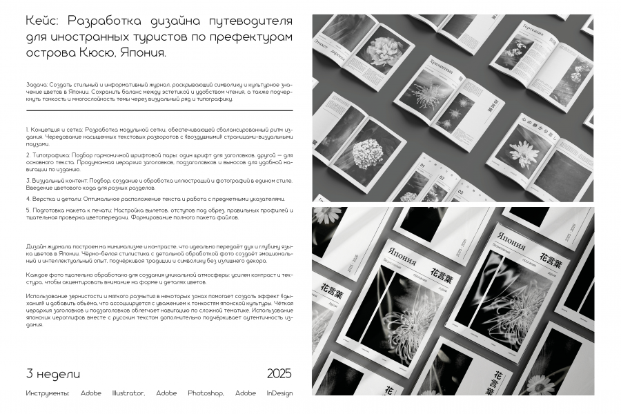 1. Концепция и сетка: Разработка модульной сетки, обеспечивающей сбалансированный ритм издания. Чередование насыщенных текстовых разворотов с «воздушными» страницами-визуальными паузами.