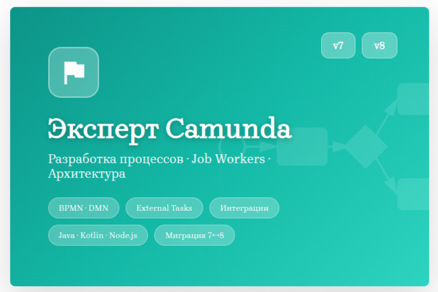 Мой стек: Camunda Platform 7 & 8 (включая 8.8 с AI-интеграцией), External Tasks, Job Workers, AI-агенты, LLM (ChatGPT, Claude, Gemini), DMN, Java, Kotlin, Node.js/TypeScript, REST/gRPC API, RabbitMQ, Kafka, Docker, Kubernetes, Prometheus/Grafana.
