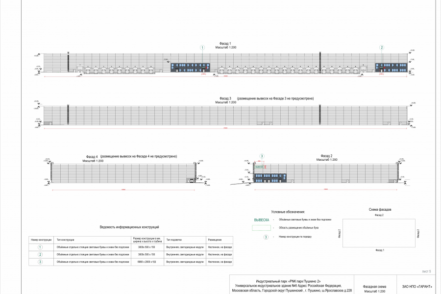 Фасадная схема здания с местами для размещения информационных конструкций, так как согласование фасадной схемы в администрации осуществляется в электронном виде, проект выполняется формате pdf. содержит чертёж фасада с размещением мест под вывески.