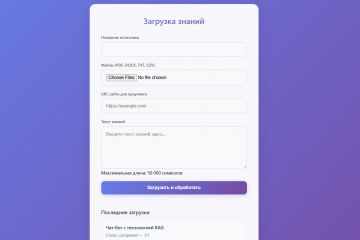 - База знаний: данные загружаются через веб‑интерфейс в виде файов или в веб‑ссылок. Текст извлекается автоматически.