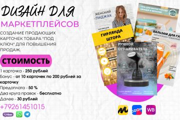 я дизайнер инфографики для маркетплейсов и я знаю, что нужно делать, чтобы карточка продавала! Работаю качественно Подчеркну преимущество товара Выделю на фоне конкурентов Индивидуальный подход