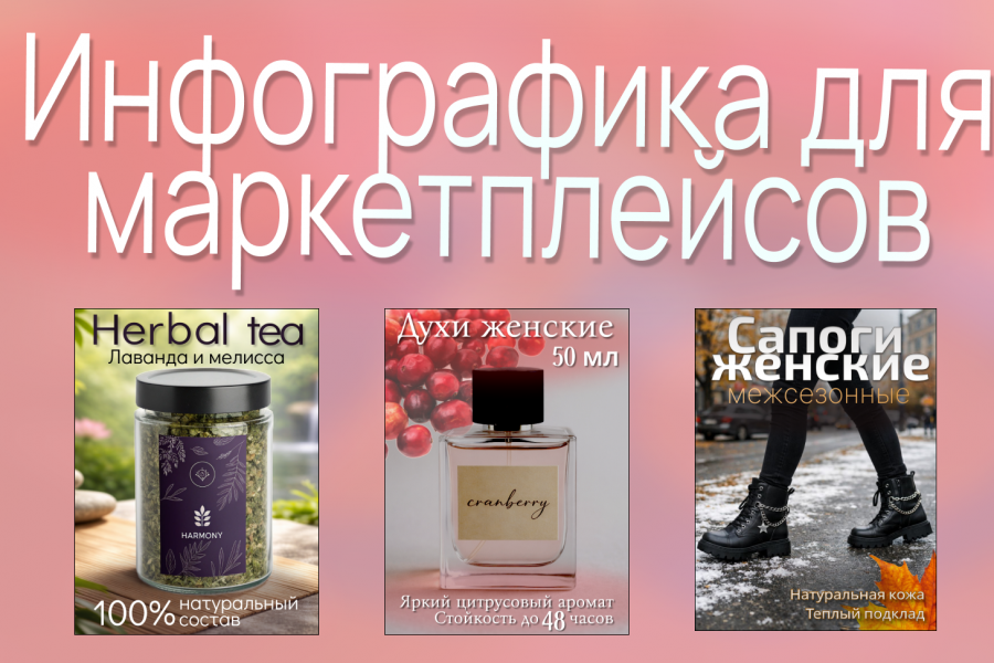 Как начинающий автор, я предлагаю инфографику для маркетплейсов по низким ценам. Это и в моих интересах - выполнить качественную работу, которая поможет вам продать товар, а мне - позволит пополнить моё портфолио.