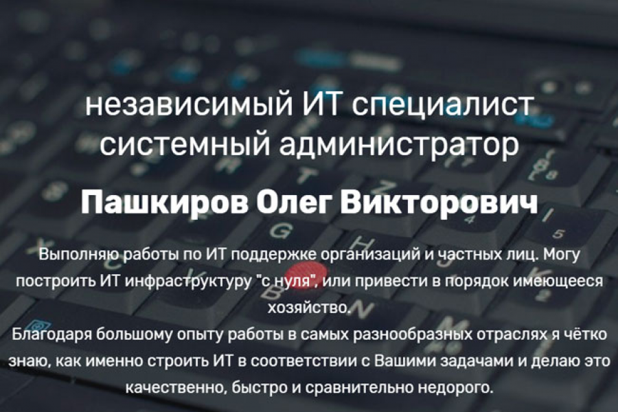 Выполняю работы по ИТ поддержке организаций и частных лиц. Могу построить ИТ инфраструктуру "с нуля", или привести в порядок имеющееся хозяйство.
