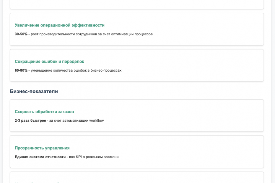 Результат: Слаженная работа отделов, сокращение ошибок на 60-80%, технологичная основа для масштабирования.