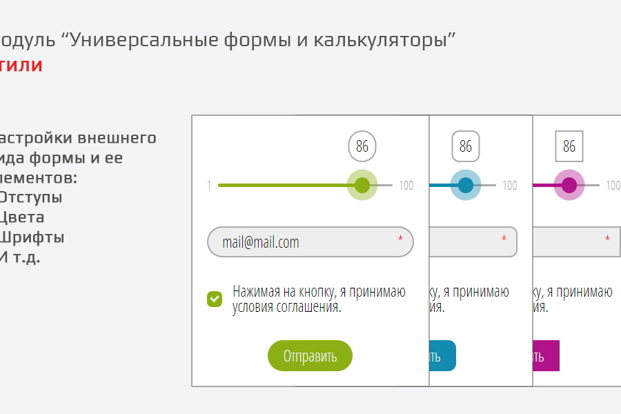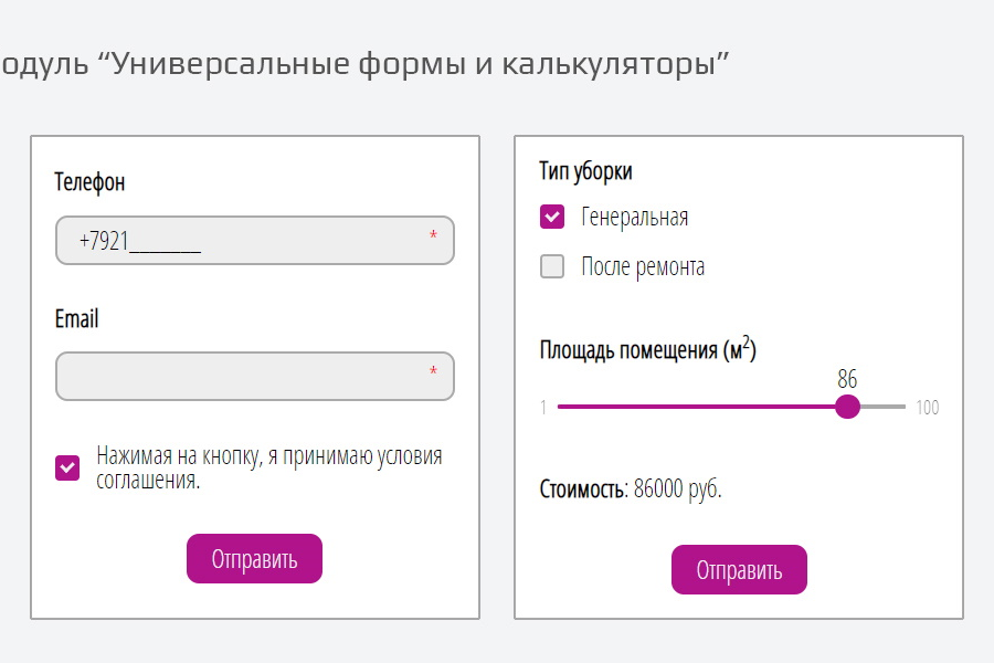 Готовый модуль для сайта, с помощью которого можно в кратчайшие сроки разместить на сайте калькулятор расчета стоимости товара или услуг. Результаты расчетов можно отправить по почте или добавить в корзину сайта. При необходимости, возможна доработка решения под Ваши нужды.
