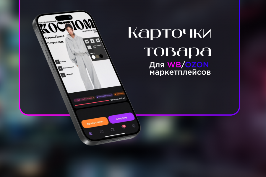 Я создам для вас продающий дизайн карточек для популярных маркетплейсов Wildberries и Ozon с инфографикой и описанием преимуществ.