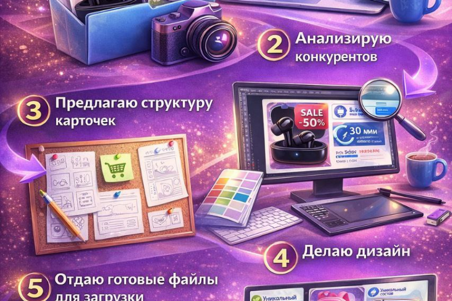 Я занимаюсь созданием дизайна карточек товаров для маркетплейсов Wildberries и Ozon.