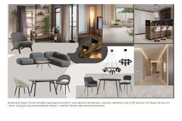 1. планировочные решения (2-4 варианта); 2. концепция дизайна (мудборды и коллажи); 3. ссылки на отделку, мебель и освещение.