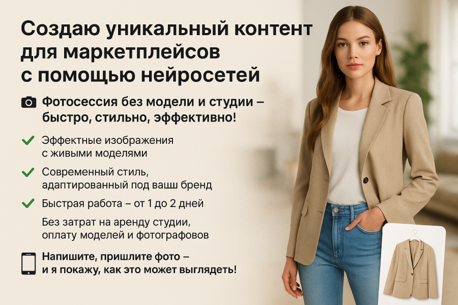 Предлагаю услугу по созданию готового визуального контента для маркетплейсов (Ozon, Wildberries, Яндекс.Маркет и др.) с использованием нейросетевых технологий.