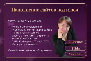 Услуги контент-менеджера: полный цикл создания и публикации контента для сайтов и интернет-магазинов. Работа с текстами, графикой и технической частью на CMS: 1С-Битрикс, Tilda, Мегагрупп и аналоги. Самописные сайты не обслуживаю.