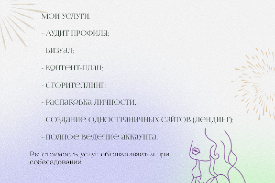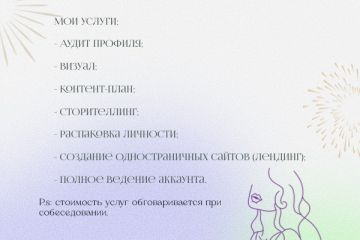 Я помогу написать контент-план, если будет необходимо, то пост(текст). В качестве бонуса сделаю визуал на 6/9/12 постов.