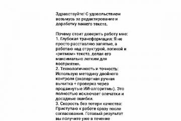 1. Глубокая трансформация: Я не просто расставляю запятые, а работаю над структурой, логикой и «ритмом» текста, делая его максимально легким для восприятия.