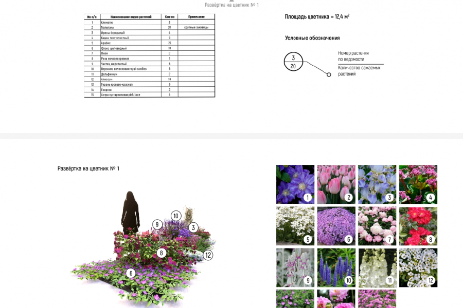 Предлагаю услуги по разработке укрупненной схемы цветника/композиции с ведомостью посадок и отрисовкой основных видовых точек.