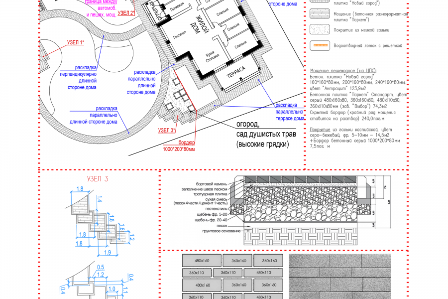 - Разбивочный чертеж (отображение на плане основных размеров, привязок к границам участка дорожек и прочих контуров / элементов благоустройства)