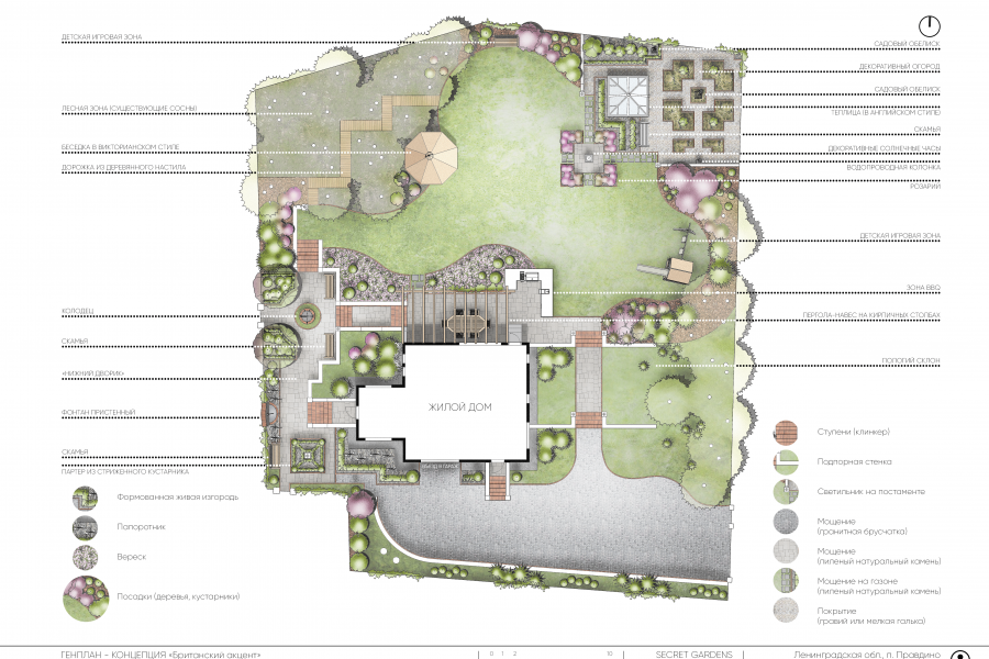 - полноценный план благоустройства и озеленения (генплан), на котором будет отображено все необходимое: строения, растения, функциональные зоны (зона барбекю, спортивная, детская, зона огорода с теплицей, хоз. зона и проч.)