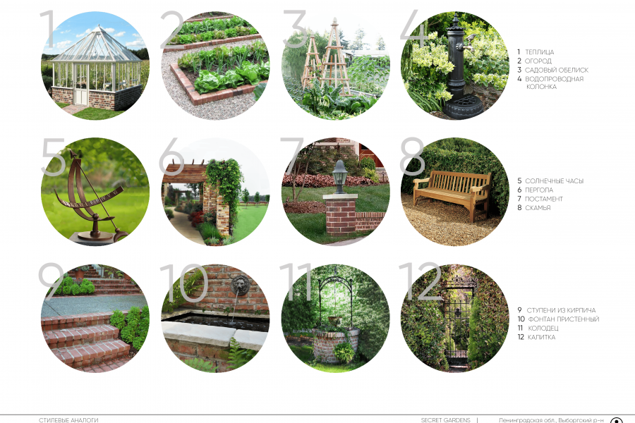 - стилевые аналоги (подборка малых архитектурных форм, материалов покрытий, основной ассортимент растений)