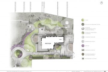 - Полноценный план благоустройства и озеленения (генплан), на котором будут отображено все необходимое: строения, растения, функциональные зоны (зона барбекю, спортивная, детская, зона огорода с теплицей, хоз. зона и проч.).