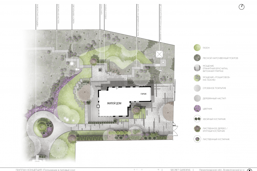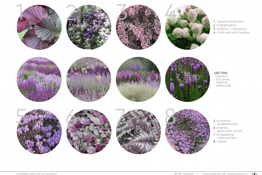 - Стилевые аналоги (подборка малых архитектурных форм, материалов покрытий, основной ассортимент растений).