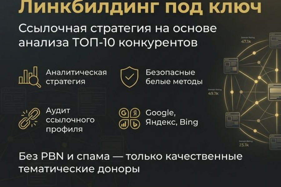 Строю качественный ссылочный профиль для вашего сайта. Ссылки с авторитетных ресурсов — один из ключевых факторов ранжирования в Google и значимый фактор в Яндексе.