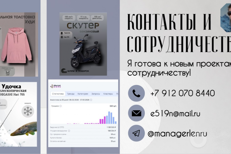 !!!Быстро обучаюсь, схватываю новые инструменты на лету. Всегда в курсе новых трендов и новостей в области маркетплейсов.