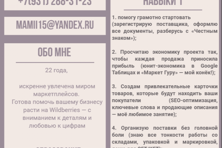 Готова помочь вашему бизнесу расти на Wildberries — с вниманием к деталям и любовью к цифрам.