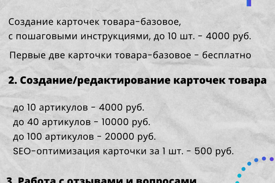 Призываю к сотрудничеству поставщиков , желающих продавать свои товары на Wildberries. Создам личный кабинет поставщика, сформирую продающие карточки товара. Так же возьму на себя seo-оптимизацию карточек товара, работу с отзывами и вопросами покупателей. Проведу анализ карточек.