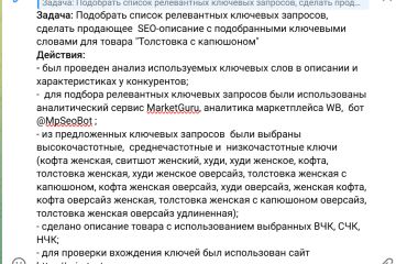 Помогаю селлерам Wildberries увеличивать продажи через грамотную работу с карточками товара: анализ ниши, SEO-оптимизацию, инфографику и улучшение конверсии.