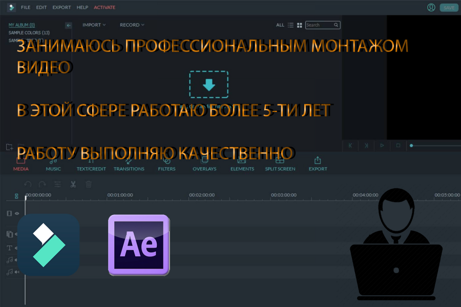 Я профессиональный монтажер , занимаюсь монтажем уже более 5-ти лет . Могу смонтировать любой видеоролик , любой сложности. Надеюсь на сотрудничество